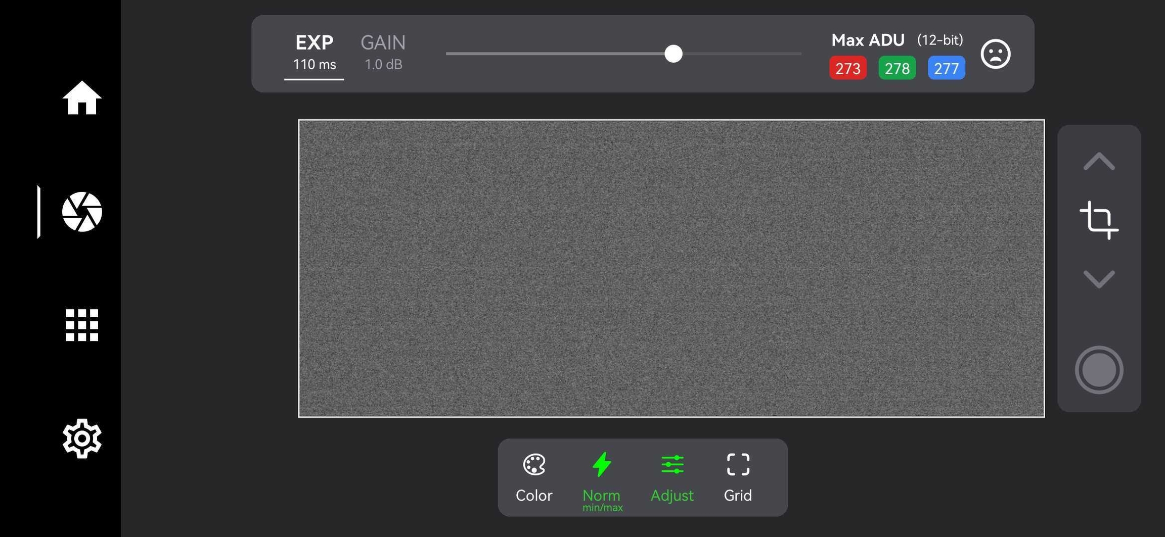 For best results - Use a low gain setting (e.g., 1 dB). - When capturing the Sun in H-alpha wavelength, work exclusively with the red channel. - Avoid overexposing or underexposing your images. A smiley icon will indicate whether your exposure settings are optimal. Note that this indicator is provided for general guidance and covers the most common scenarios.